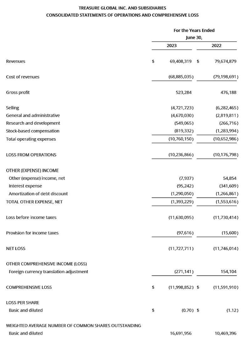 NEW YORK and KUALA LUMPUR, Sept. 29, 2023 (GLOBE NEWSWIRE) -- Treasure Global Inc (NASDAQ: TGL) (“TGL”, or the “Company”), an innovative technology solutions provider, today reported its financial results for the fourth quarter and fiscal year ended June 30, 2023.